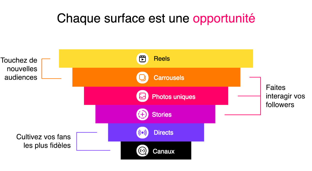 Instagram en utilise quatre, chacun pour un format : Feed, Stories, Explore, Reels.