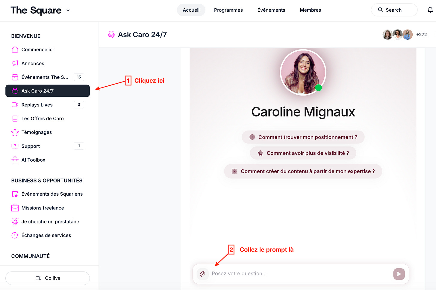 Alors tu peux rejoindre The Square, où Ask Caro est disponible 24/7.
